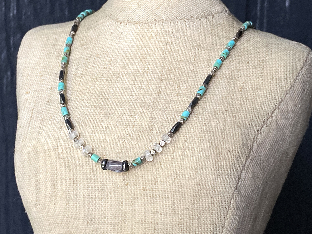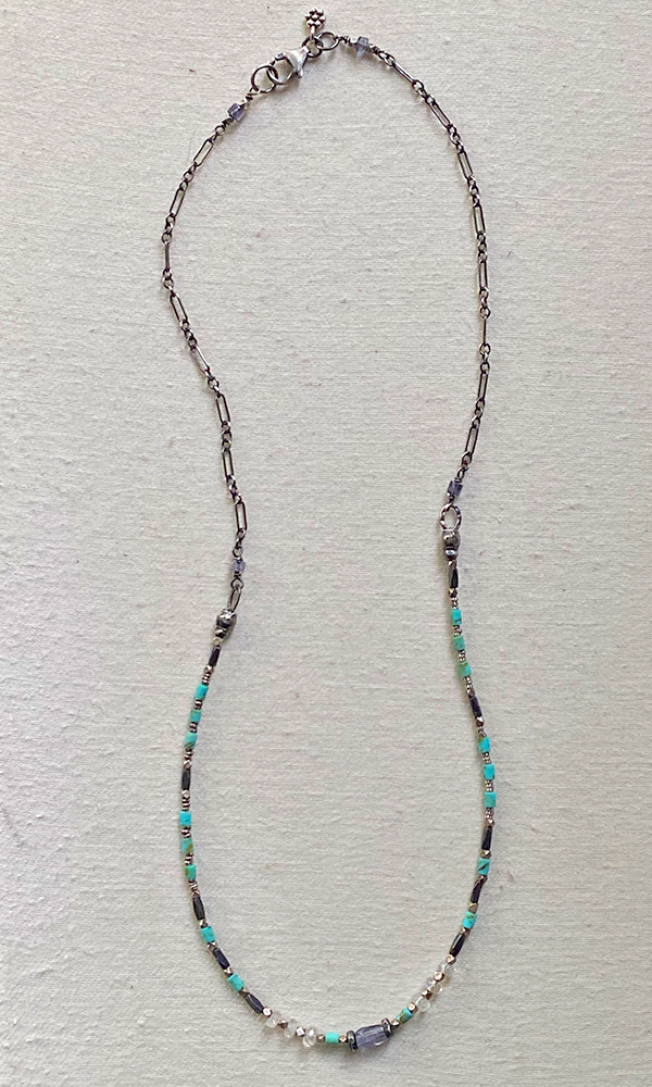 The Kingman Turquoise Kaleidoscope Necklace gives you the best of both worlds. Delicate, drawn sterling silver cable chain leads you to a kaleidoscope of colors. Kingman Turquoise, and iridescent rainbow moonstone mingle amongst oxidized and brushed Thai silver beads. A single, faceted iolite stone rests at the very center. Hammered sterling silver links and tiny iolite accents complete the piece. The necklace measures 18 inches long and closes with a sterling silver lobster clasp and signature daisy charm.