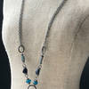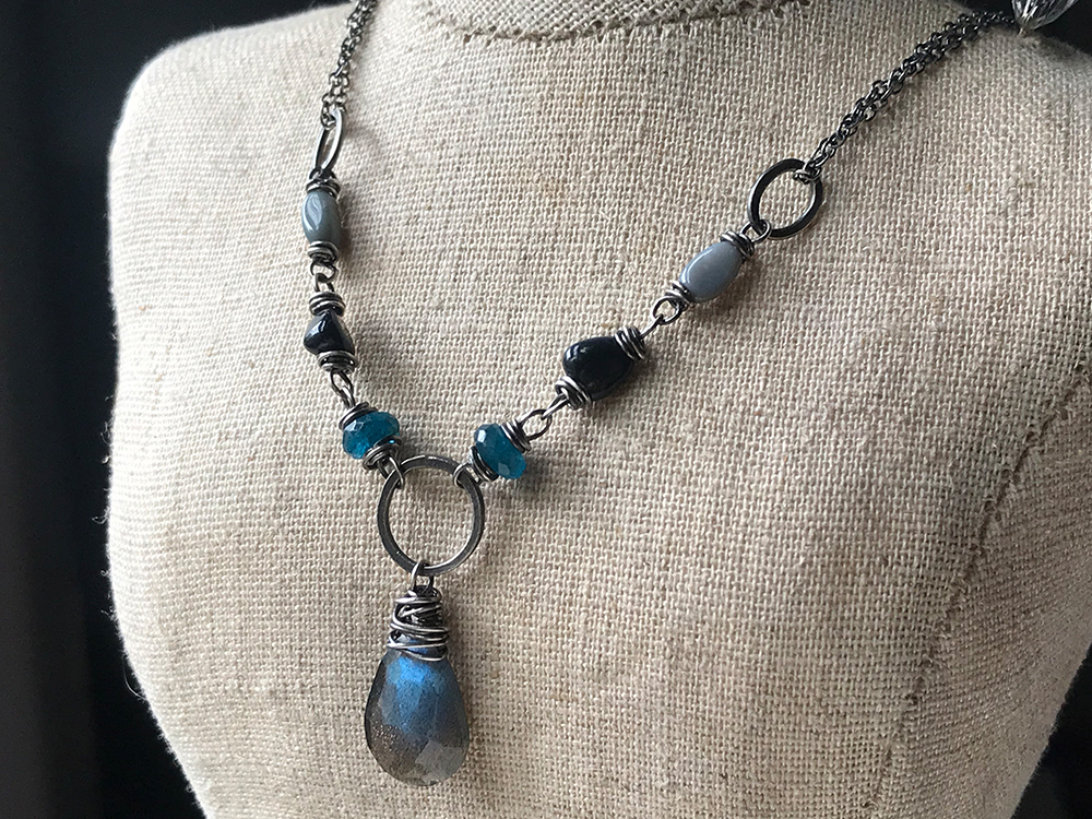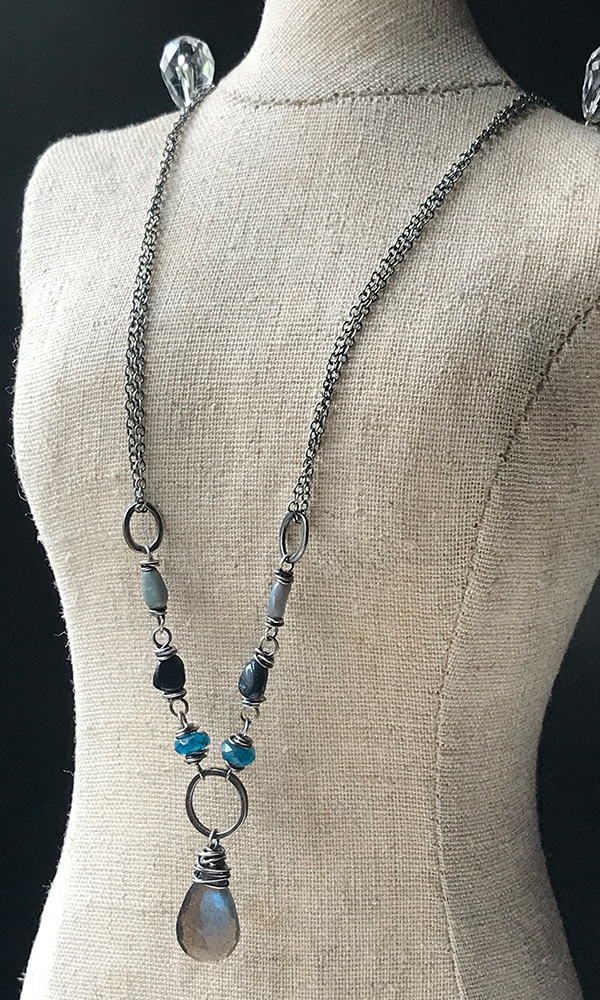 Deep shades of blue, grey and purple make our Anemone Necklace a show stopper. A deeply iridescent labradorite tear drop pulls its flash from its Australian opal and deep blue apatite neighbors. Double strands of oxidized sterling chain complete the piece. Necklace measures 18 inches long, closes with a sterling lobster clasp and signature daisy charm.