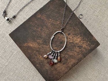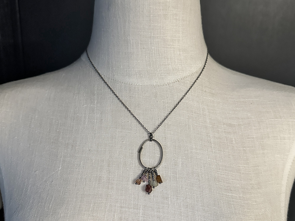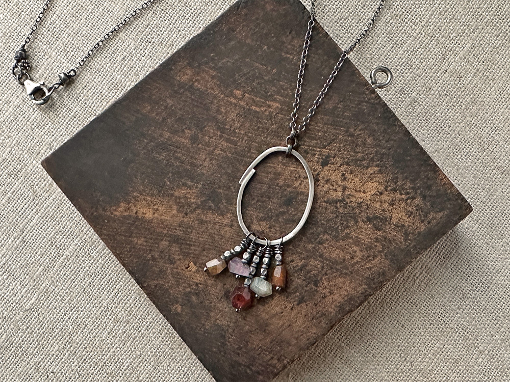 The idea for this pendant was taken straight out of my sketchbooks. I have this way of circling things I want to remember with slightly misshapen circles. Sometimes I doodle over the top of them and give them dimension, and voilà ! The Sketchbook Sapphire Pendant was born! Nuggets of sapphire in a host of shades, swing from a perfectly-imperfect circular pendant. Thai silver beads accent the sapphire fringe adding to its rustic appeal.