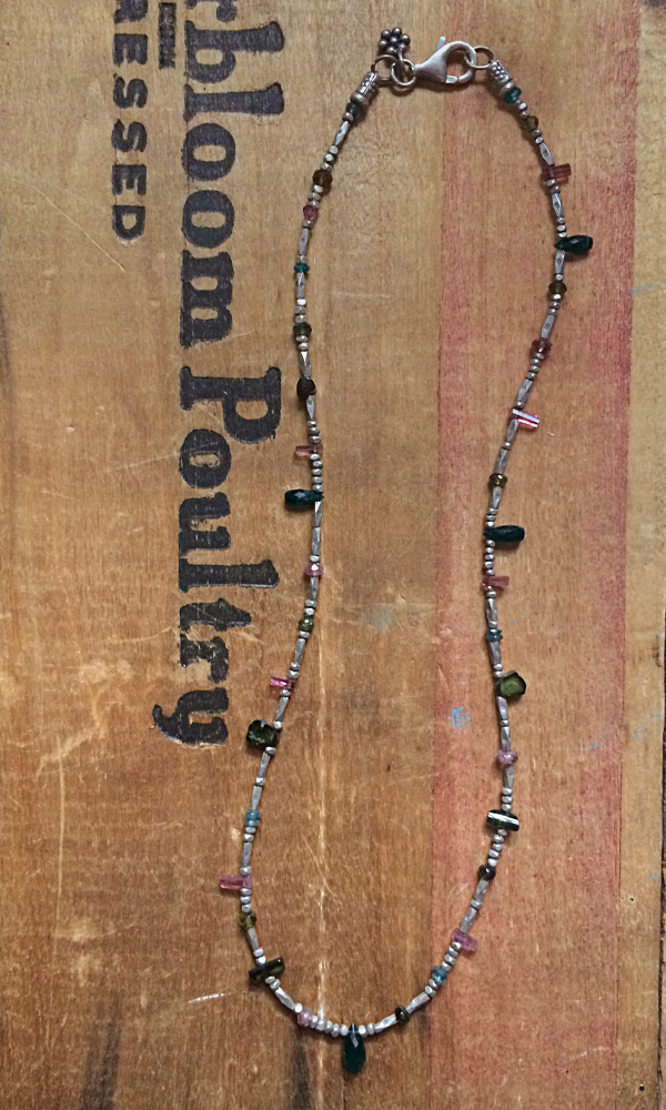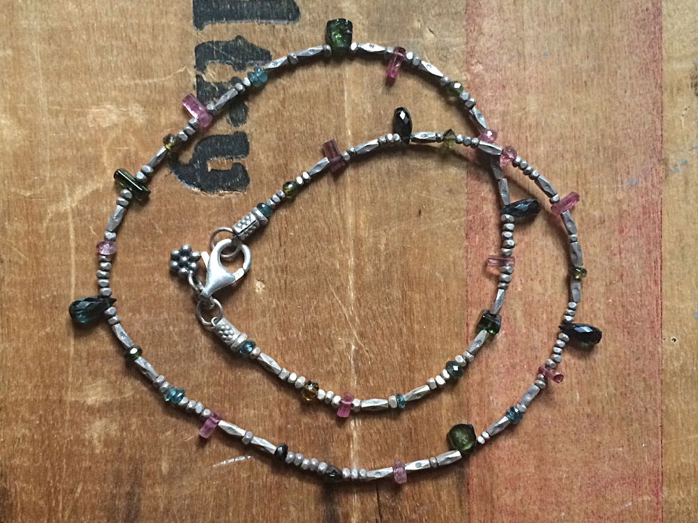The Tourmaline Kaleidoscope Necklace is a feast for the eyes. Every color of tourmaline that is imaginable can be found in this stunning piece. Blue, green, rose, amber; each with their unique shape, dance between tiny Thai silver beads. Sterling silver clasp and signature daisy charm complete the piece. Measures 16″ long.
