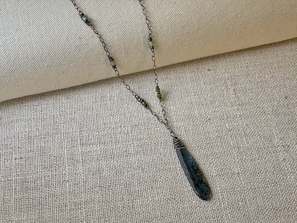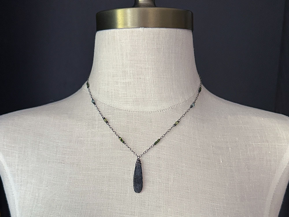 Indigo kyanite makes the Wire-Wrapped Kyanite Pendant necklace a collector’s dream. And when a stone is this pretty, it deserves all the attention! Indigo kyanite, delicately wire-wrapped in oxidized sterling silver, punctuated by tiny gemstone accents.